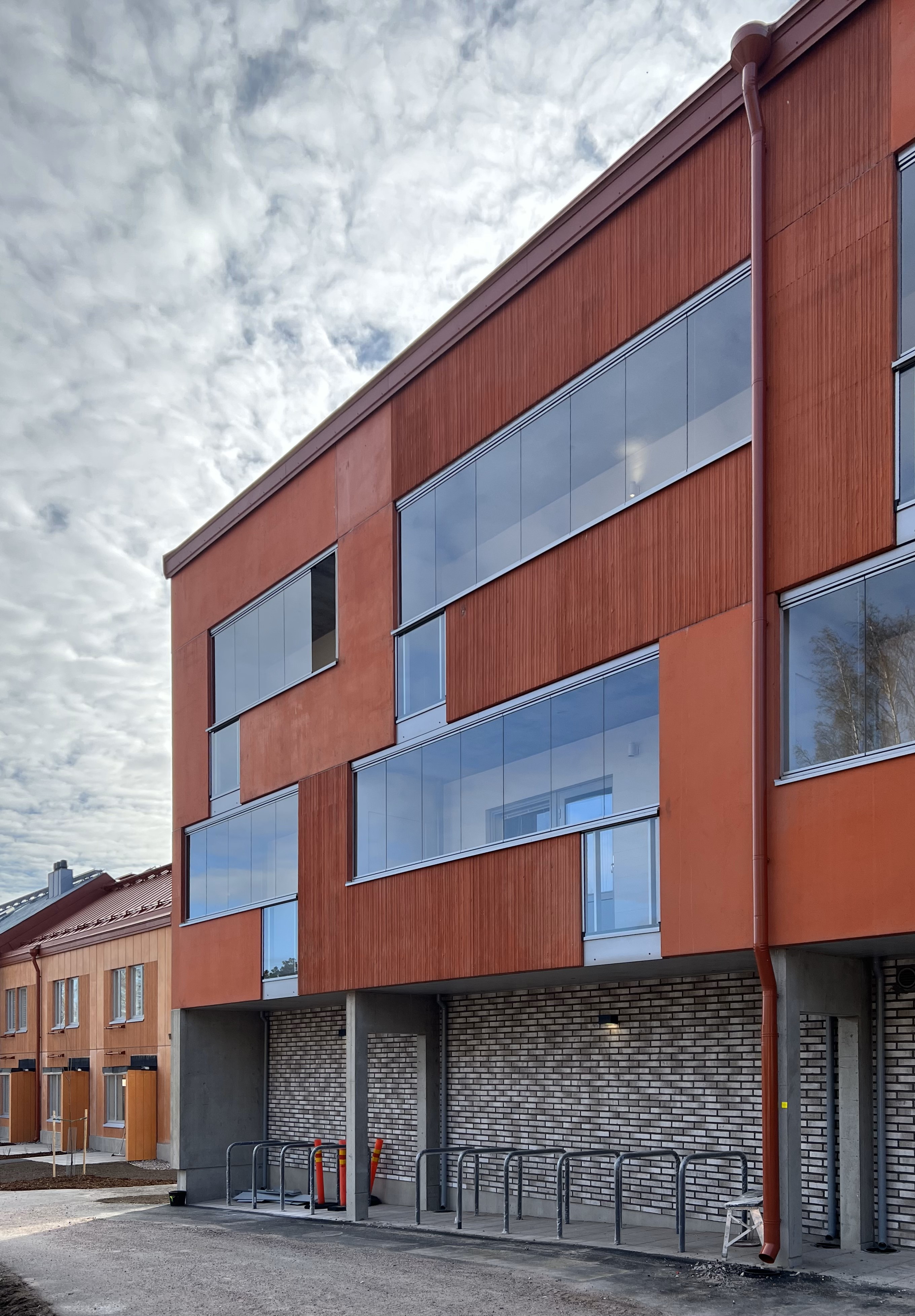 Rakennuksen runkomateriaalit on betonia. Julkisivut ovat väribetonia ja puhtaaksimuurattua tilltä.