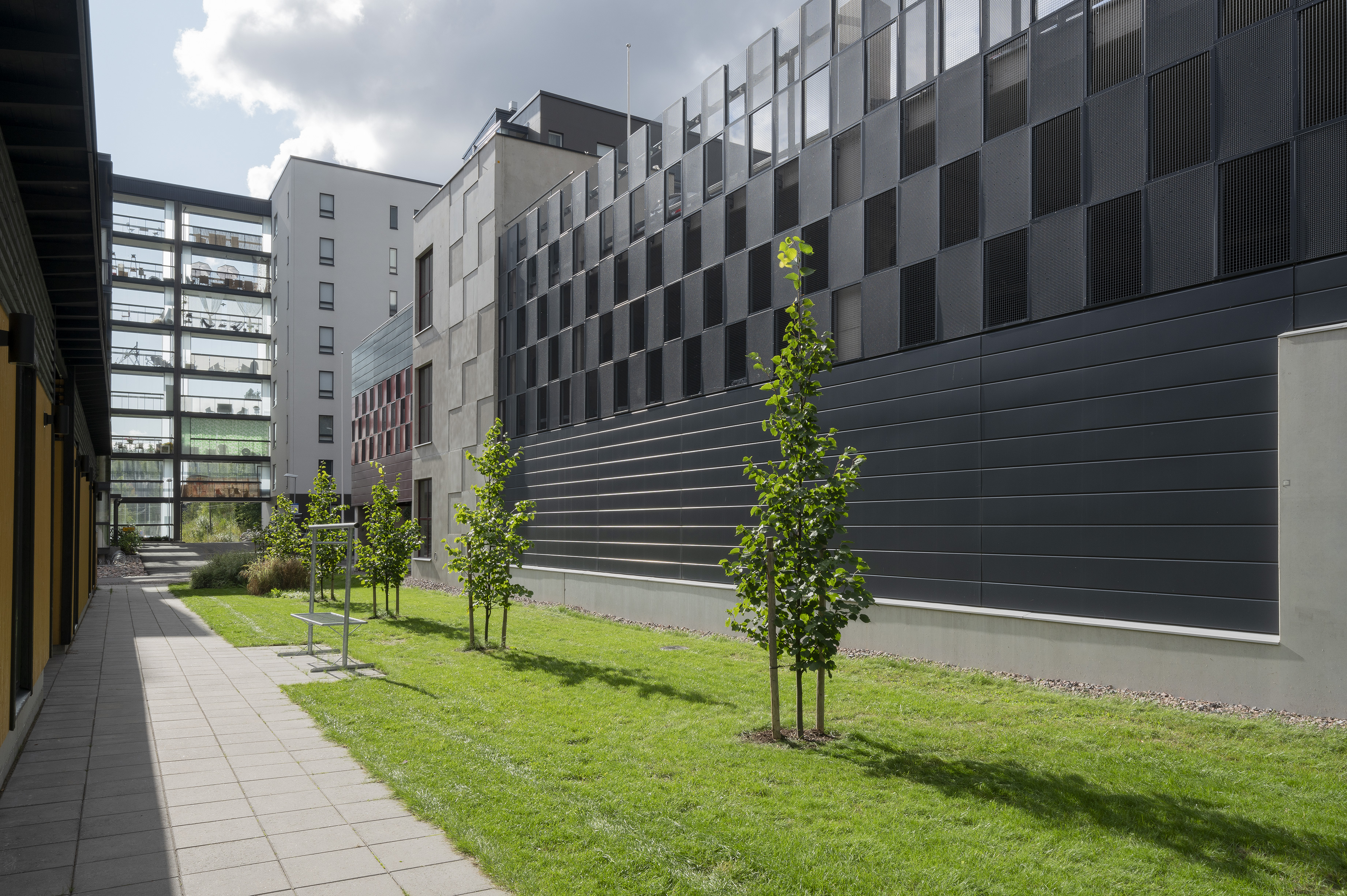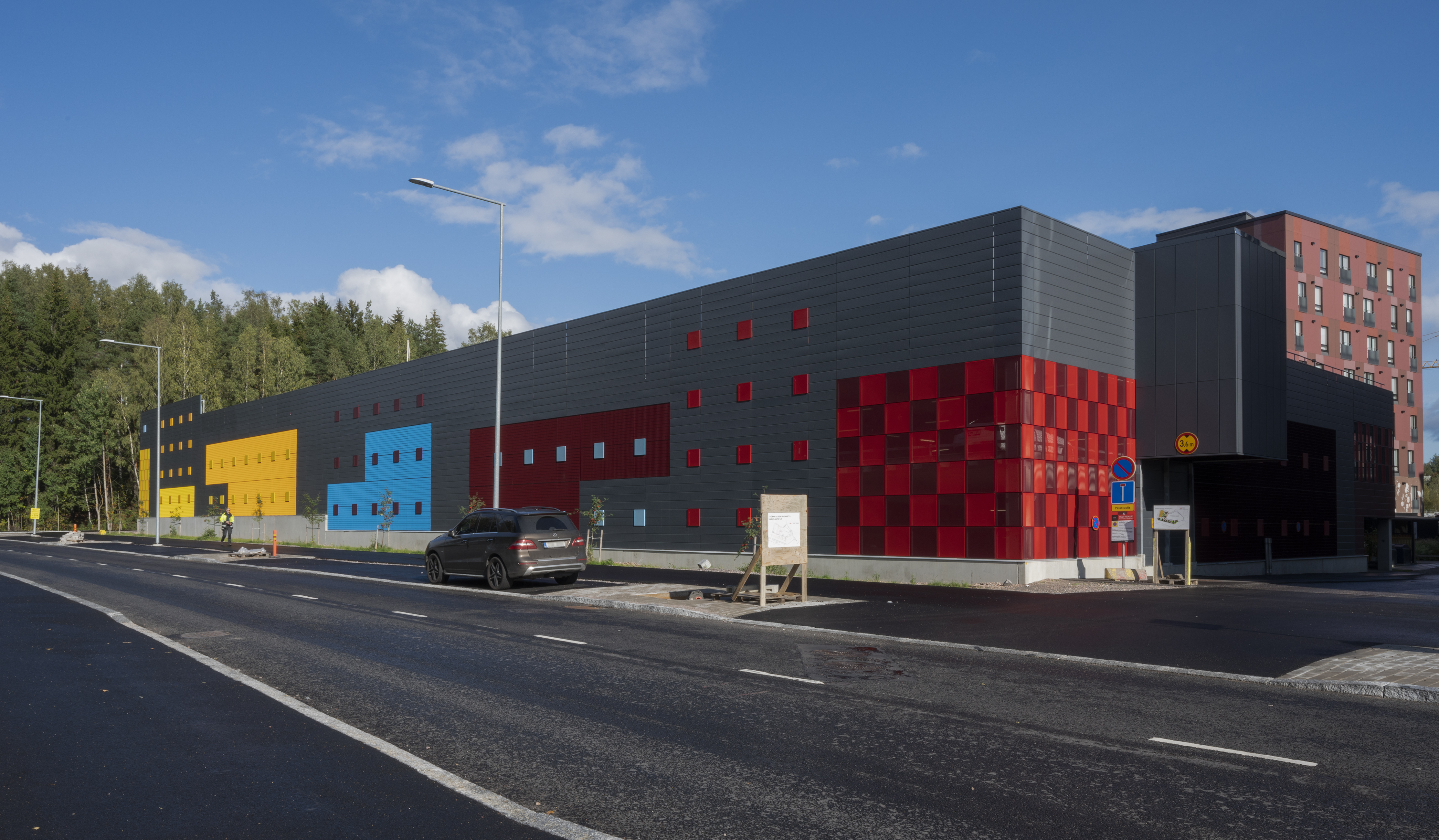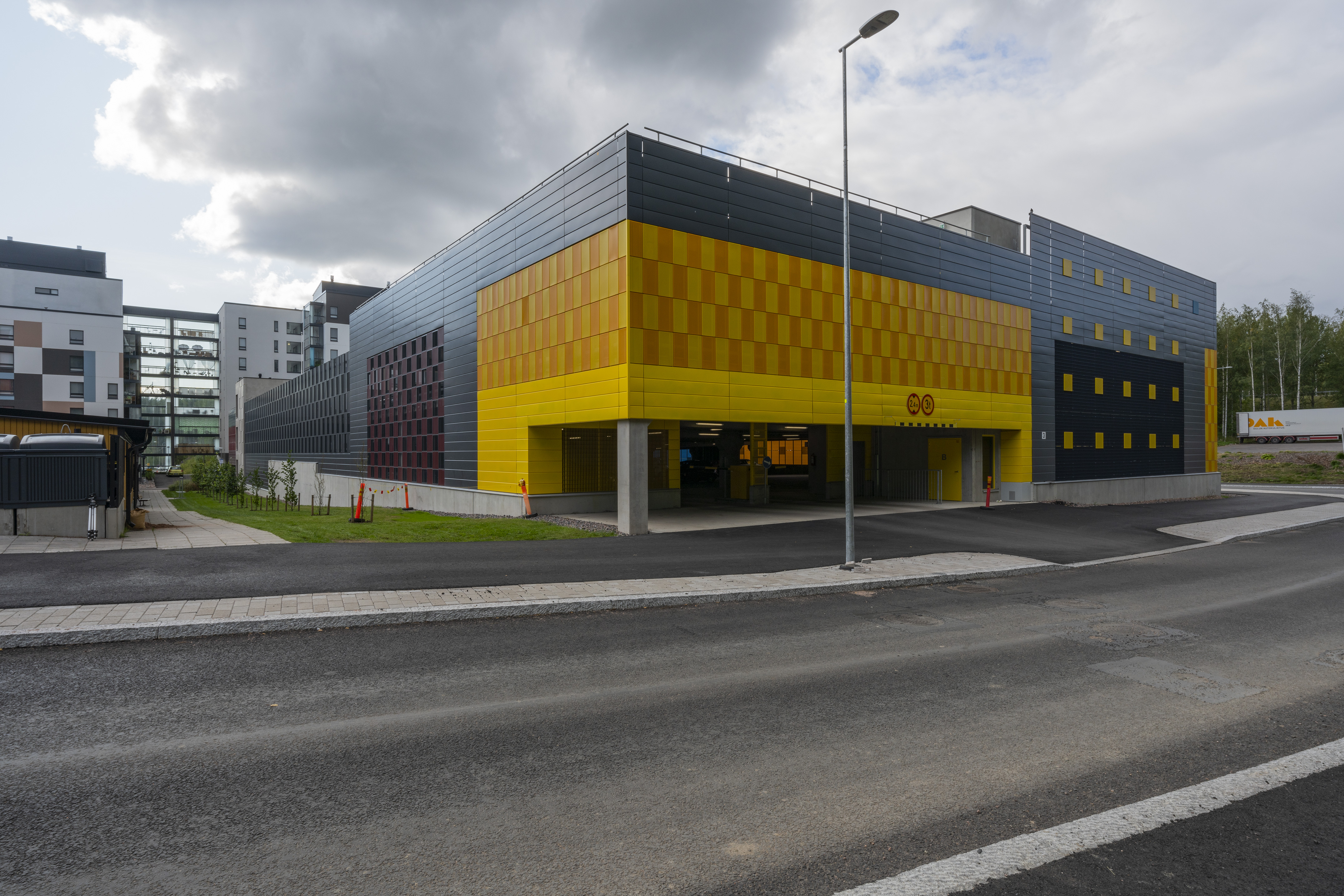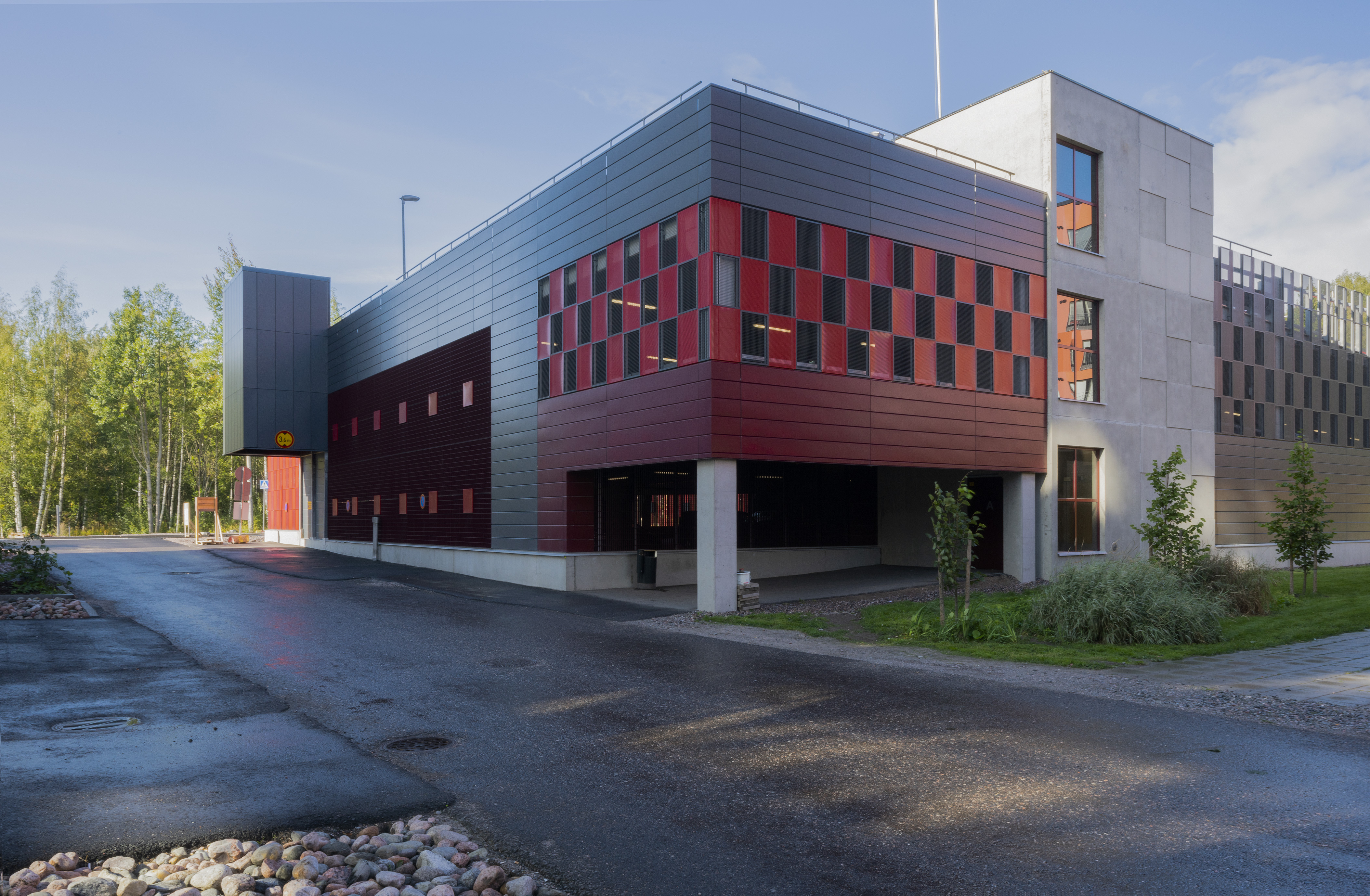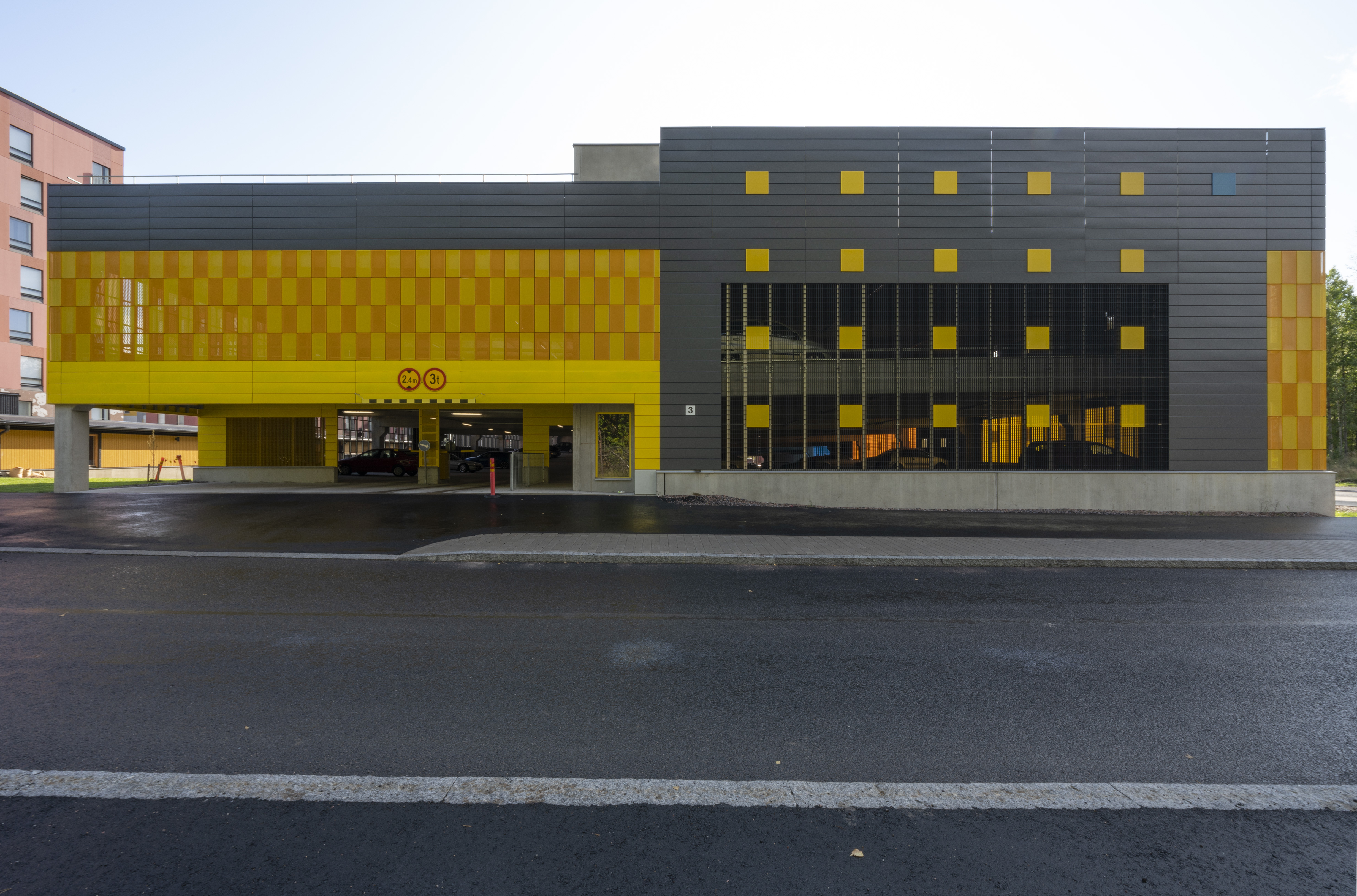 Asuinalueen puolella pysäköintirakennuksen julkisivu toimii taustana alueen yhteiskäyttöiselle kerhotilarakennukselle. Alueelle johtavan tien puolella pysäköintirakennuksen julkisivu on piristävän värikäs. Sisäänkäyntejä on korostettu värillä. Julkisivussa näkyvät värikkäät pinnat ovat eriväristä perforoitua teräslevyä ja ritiläverkkoa. Verkkomateriaalien läpi siivilöityvä valo luo sisätilaan erivärisiä pintoja ja varjoja. Kohtisuoraan katsoessa ritiläverkosta näkyy läpi, esim. pysäköintirakennuksen päädyssä verkko avaa maisemanäkymän metsään. Asuinalueen puolella perforoitu teräslevy-materiaali peittää näkymiä enemmän.