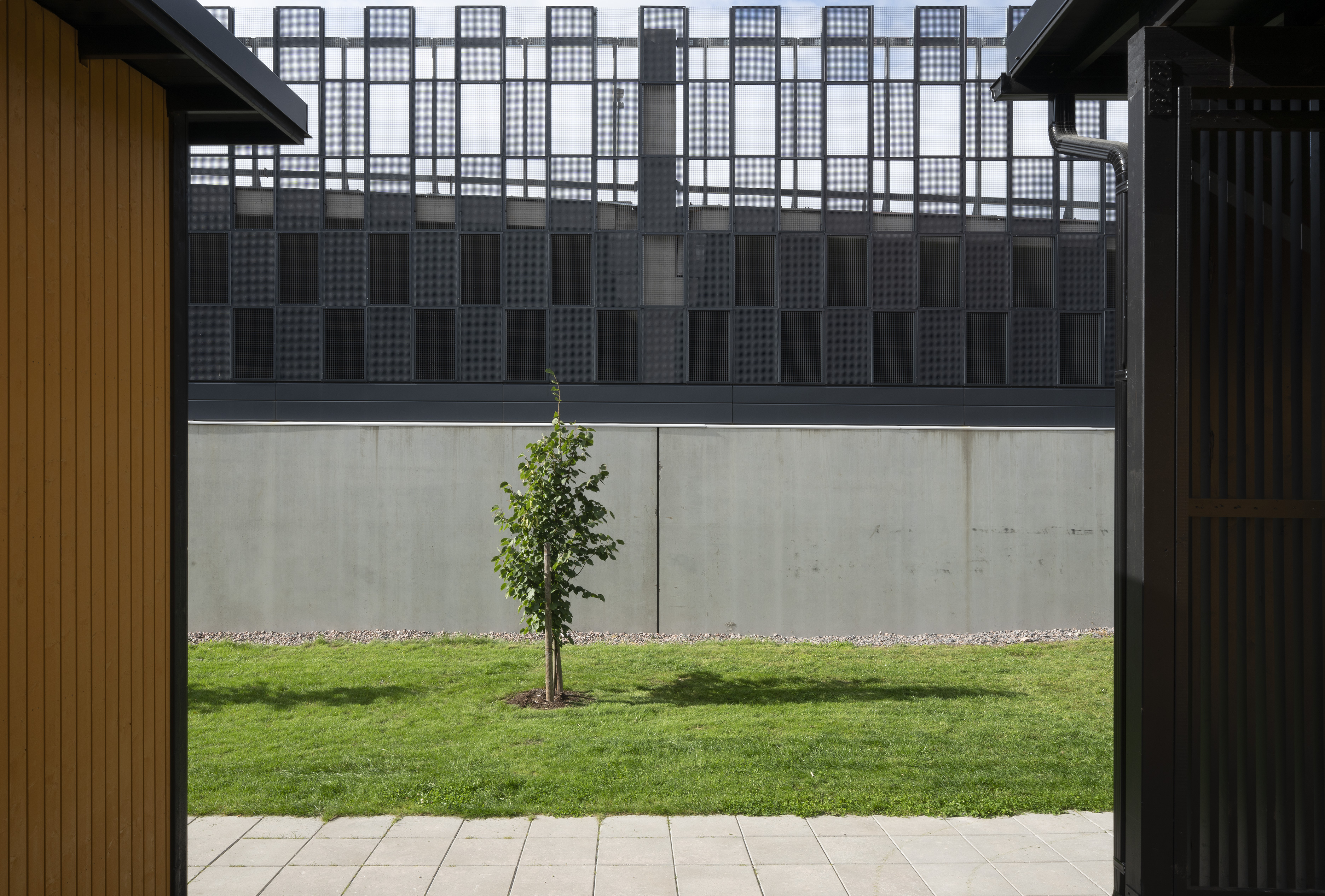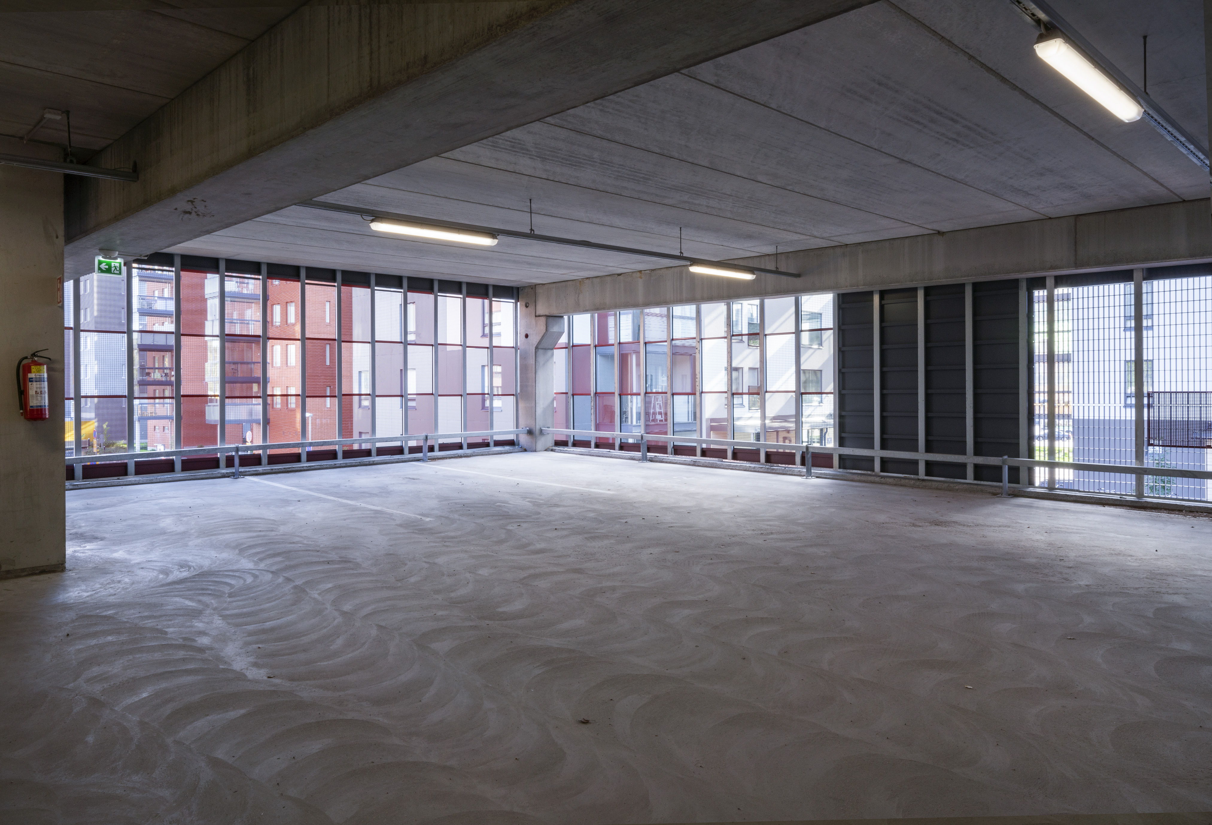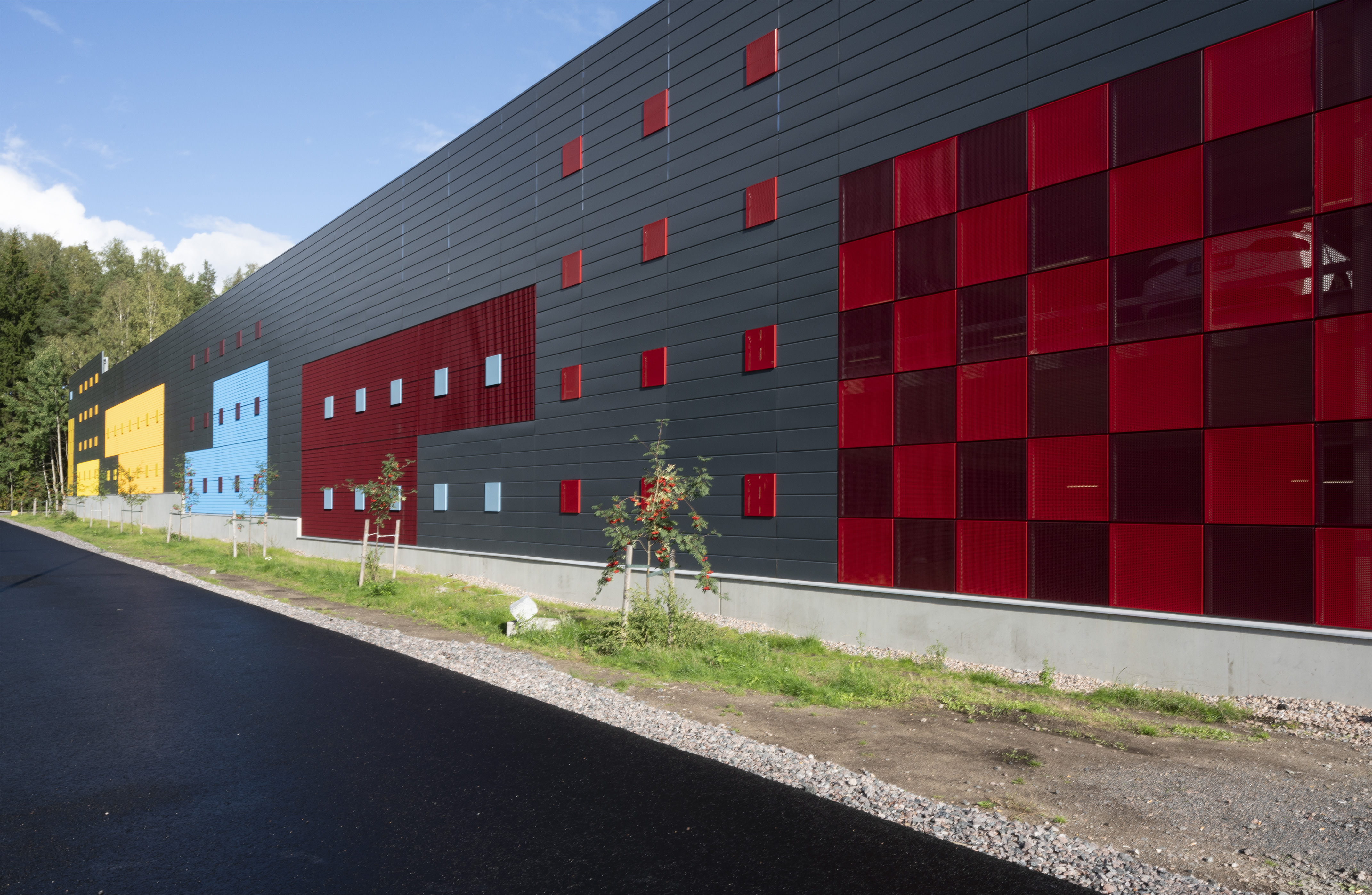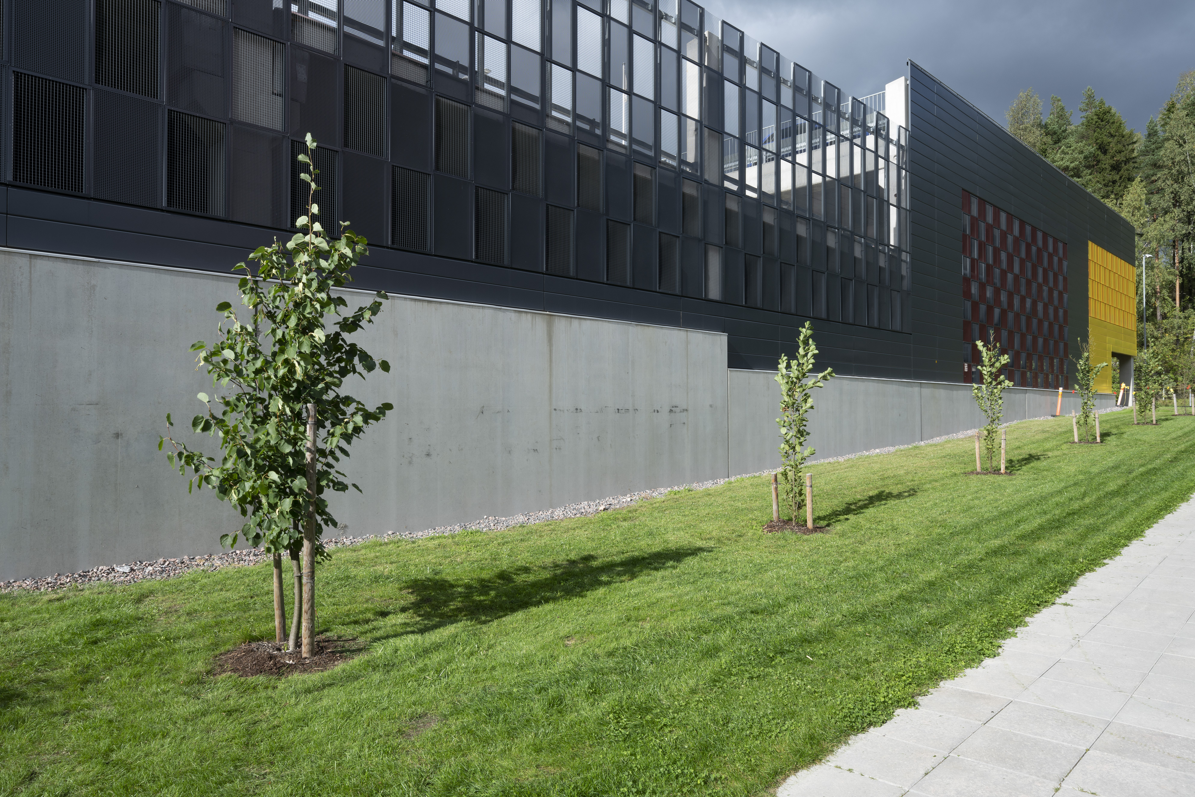 Asuinalueen puolella pysäköintirakennuksen julkisivu toimii taustana alueen yhteiskäyttöiselle kerhotilarakennukselle. Alueelle johtavan tien puolella pysäköintirakennuksen julkisivu on piristävän värikäs. Sisäänkäyntejä on korostettu värillä. Julkisivussa näkyvät värikkäät pinnat ovat eriväristä perforoitua teräslevyä ja ritiläverkkoa. Verkkomateriaalien läpi siivilöityvä valo luo sisätilaan erivärisiä pintoja ja varjoja. Kohtisuoraan katsoessa ritiläverkosta näkyy läpi, esim. pysäköintirakennuksen päädyssä verkko avaa maisemanäkymän metsään. Asuinalueen puolella perforoitu teräslevy-materiaali peittää näkymiä enemmän.