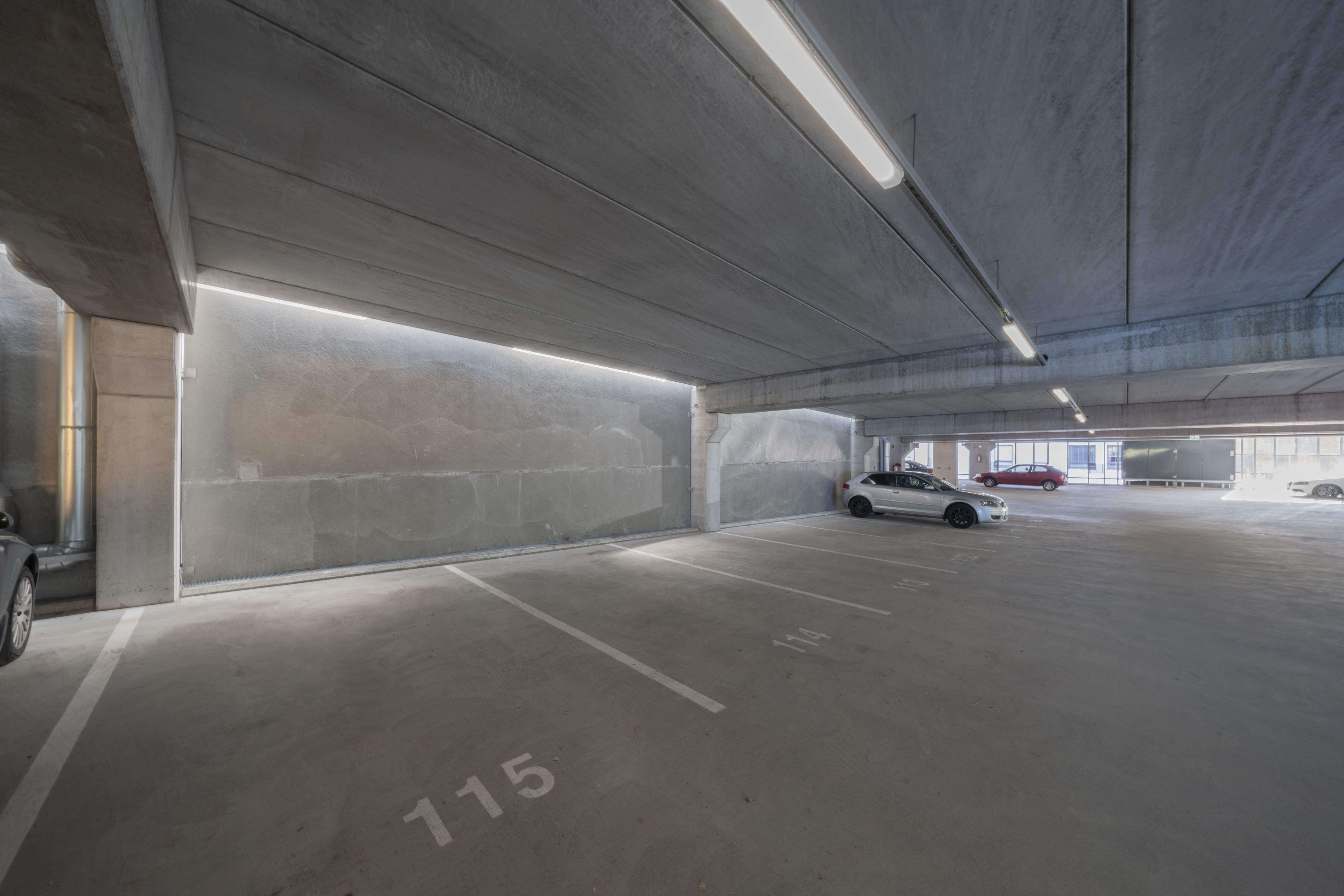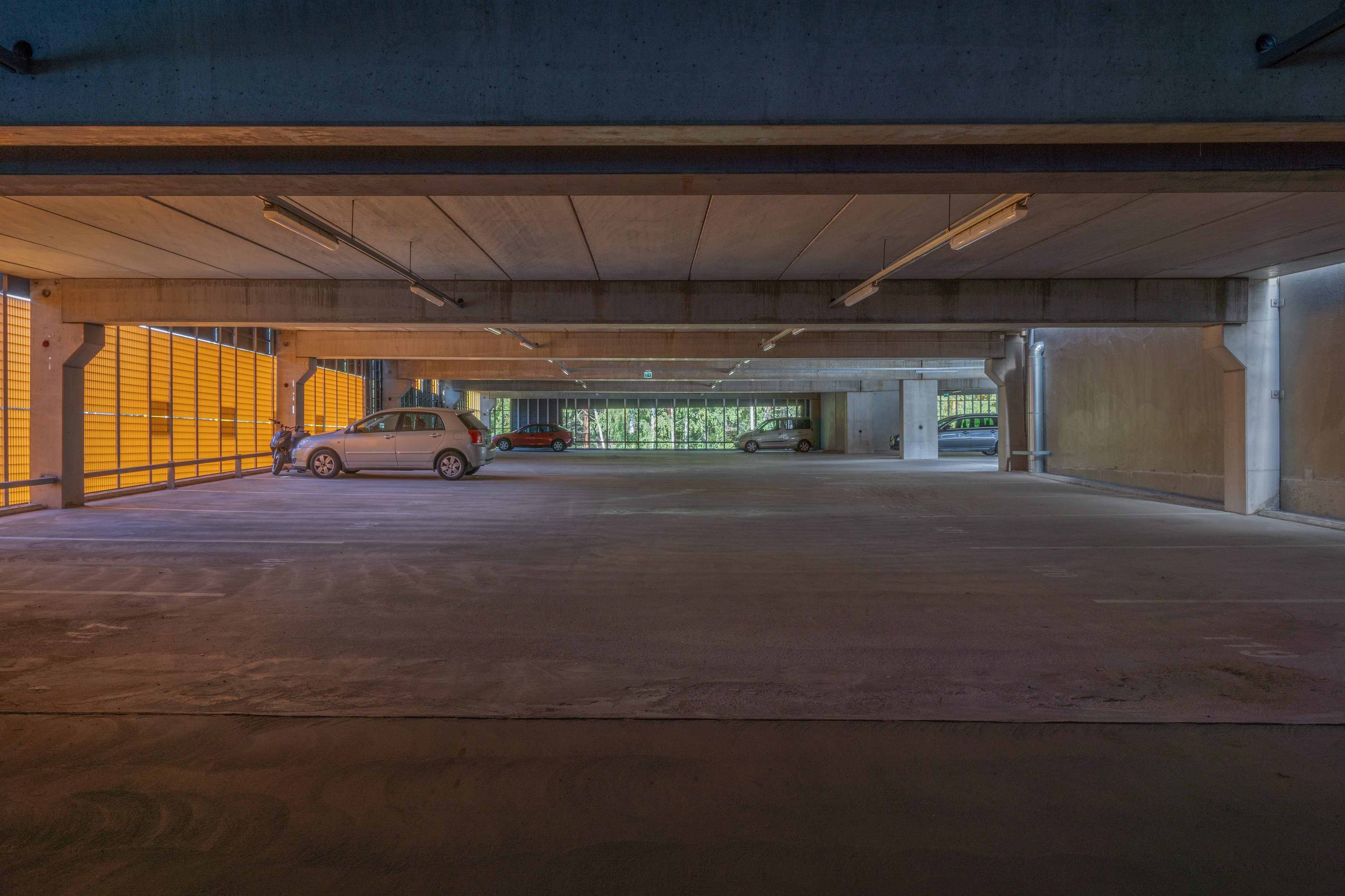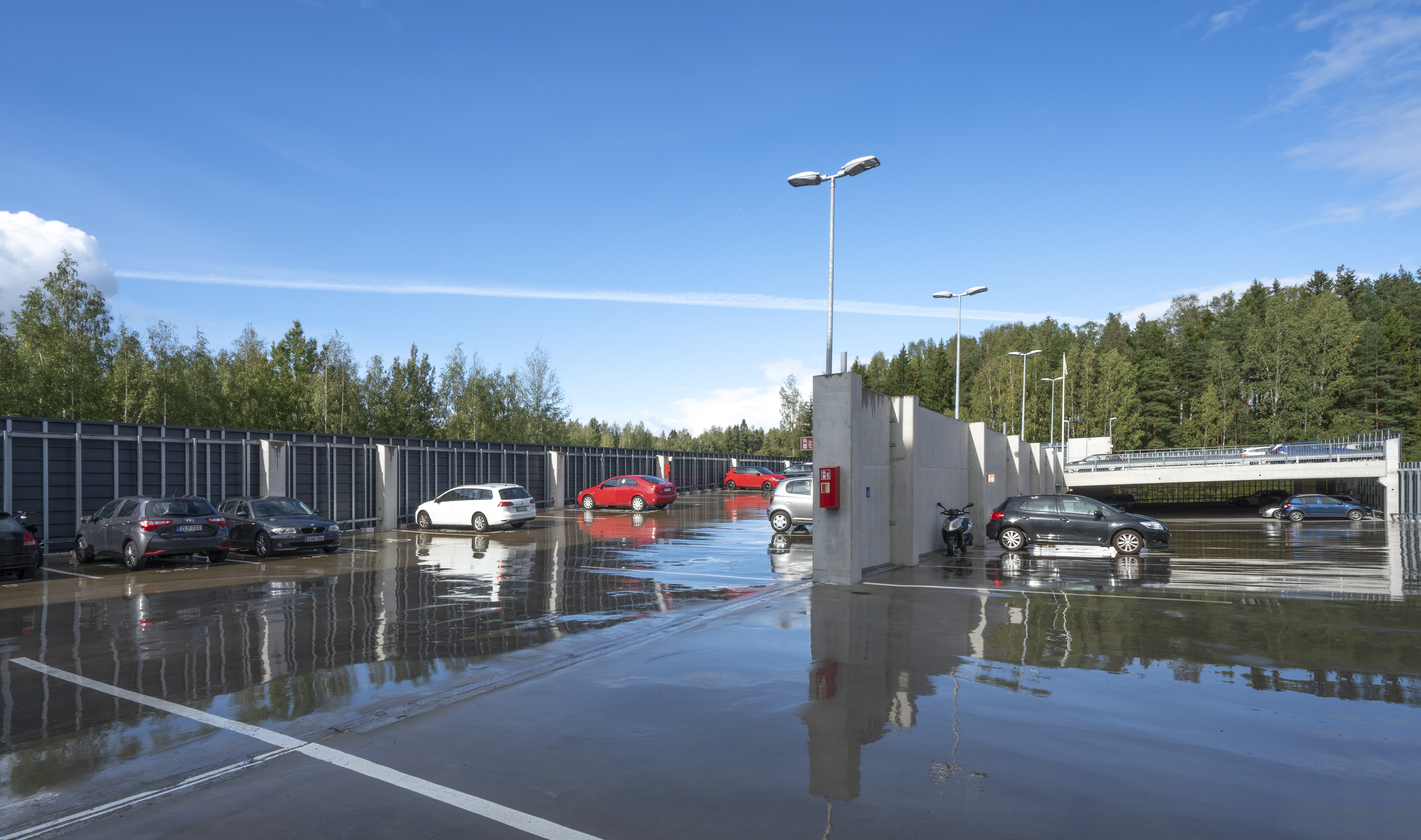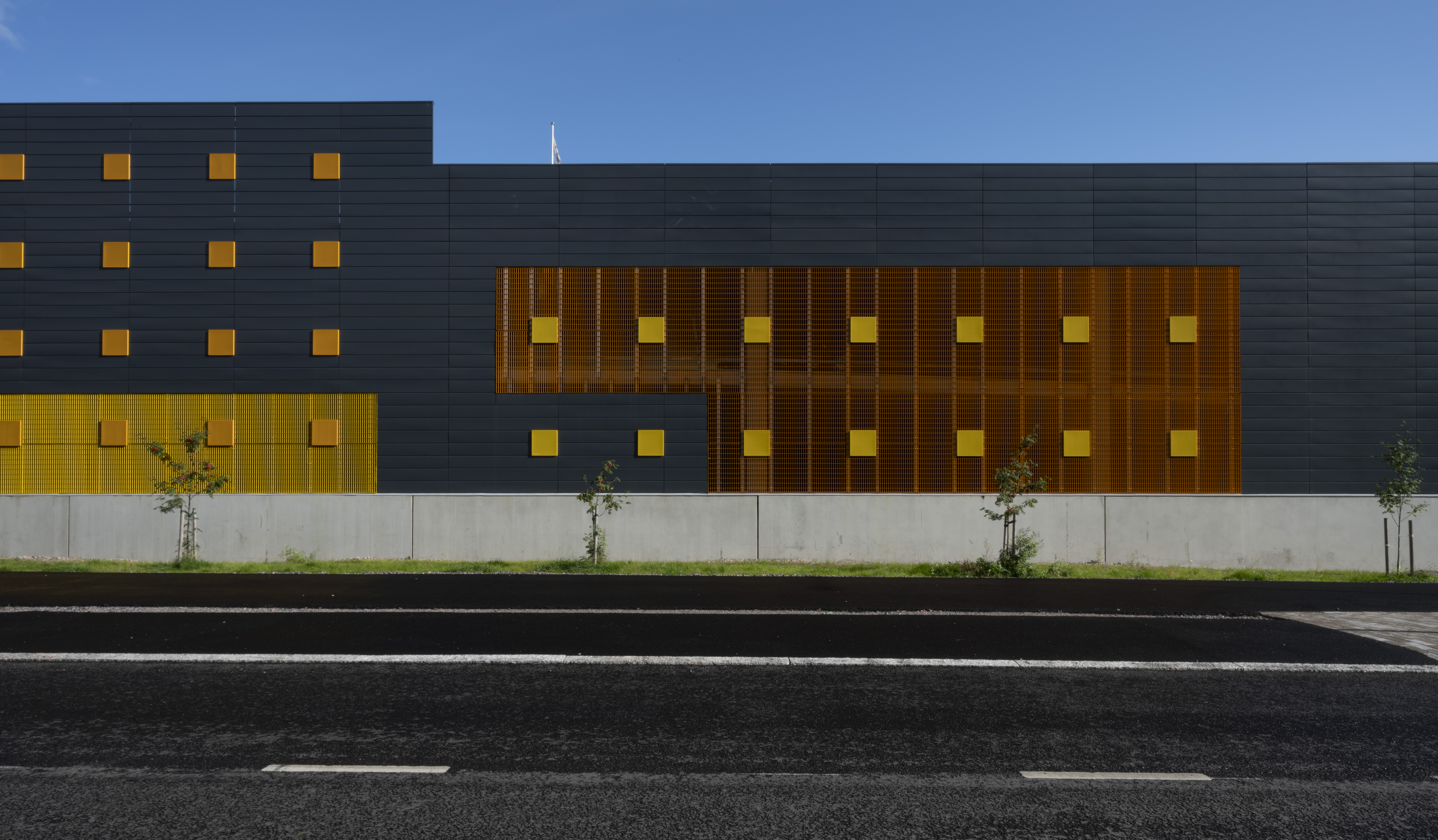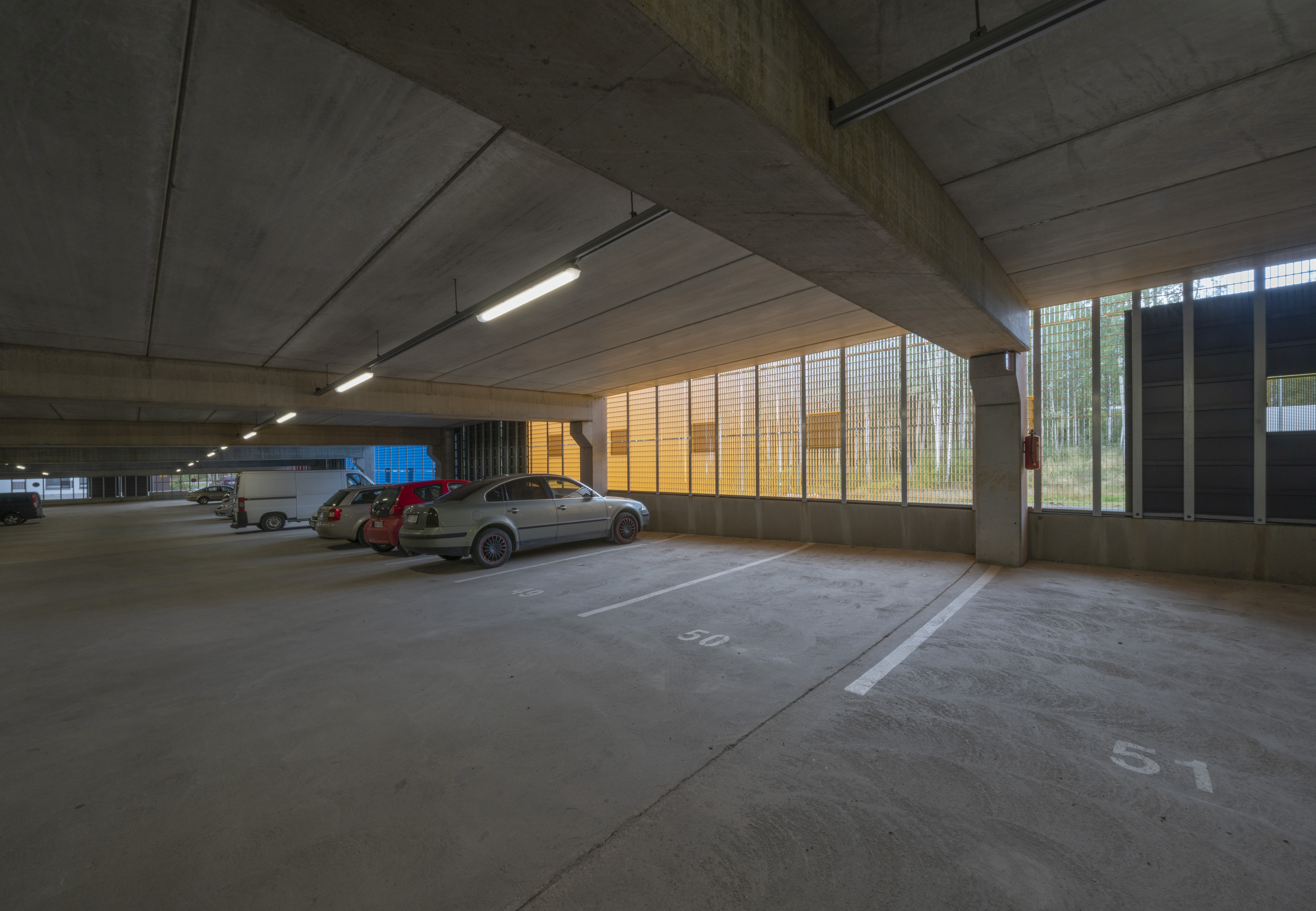 Asuinalueen puolella pysäköintirakennuksen julkisivu toimii taustana alueen yhteiskäyttöiselle kerhotilarakennukselle. Alueelle johtavan tien puolella pysäköintirakennuksen julkisivu on piristävän värikäs. Sisäänkäyntejä on korostettu värillä. Julkisivussa näkyvät värikkäät pinnat ovat eriväristä perforoitua teräslevyä ja ritiläverkkoa. Verkkomateriaalien läpi siivilöityvä valo luo sisätilaan erivärisiä pintoja ja varjoja. Kohtisuoraan katsoessa ritiläverkosta näkyy läpi, esim. pysäköintirakennuksen päädyssä verkko avaa maisemanäkymän metsään. Asuinalueen puolella perforoitu teräslevy-materiaali peittää näkymiä enemmän.