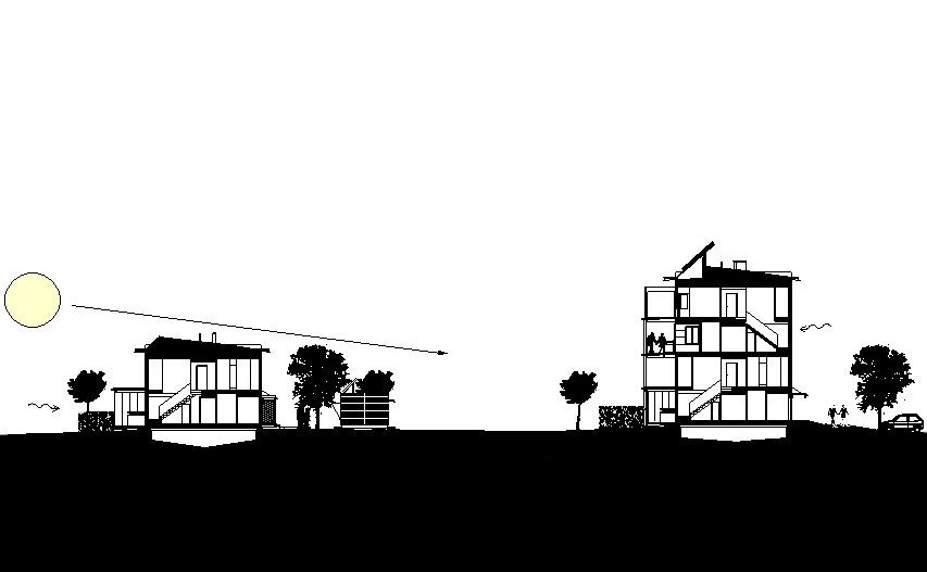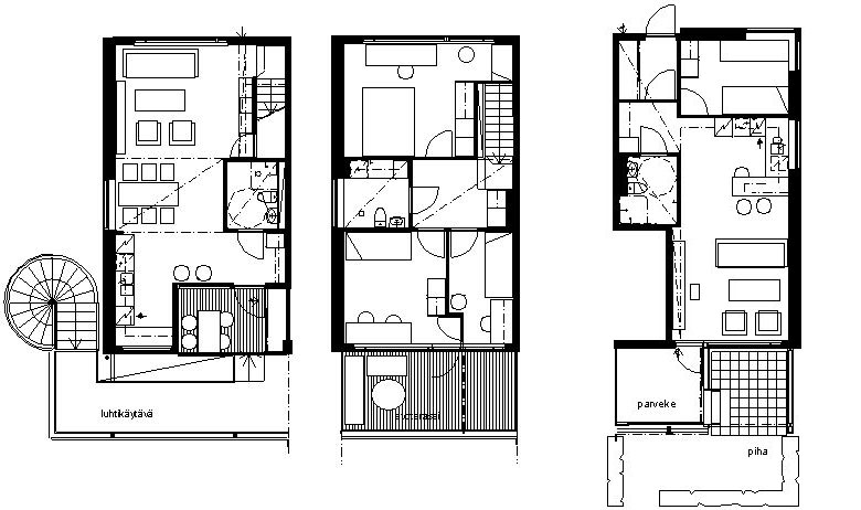 Kerrostalon ratkaisuna on sijoittaa kahdenkerroksen asuntoja päällekkäin. Alempiin asuntoihin pääsee maantasosta ja ylempiin luhtikäytävältä, josta on yhteys pienasuntojen porraslamelliin, talosaunoihin ja teknisiin tiloihin. Rivitalojen toiseen päähän on sijoitettu pienasuntoja kerroksiin.